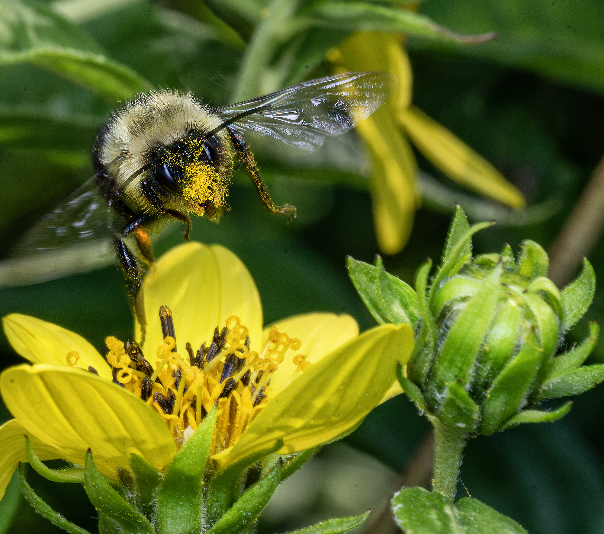 I am not exclusively a single subject in nature photographer. I like shooting anything and everything that I find attractive, interesting, educational, or unusual. In nature I like shooting landscapes, weather, wildlife and macros. I also enjoy photographing cityscapes, buildings, pets and people. I consider myself to be a generalist photographer who probably shoots nature subjects 80% of the time. Reading about Flip Pallot’s life well lived is inspiring. I woke to my alarm clock at 5:15 this morning to get out before daybreak light lit up the sky. Sunrise turned out to be very uninspiring, so I pivoted and set up my macro rig and struck out for tiny world. I got a few keepers today, the first of which is seen here: a bumble bee hovering with a pollen beard. I send credit to a man I never met or even knew of until after he had passed away. I was inspired to get back out there once again and let being out in nature with my passion allow the thoughts and angsts of everyday life drift away for a while. He loved that about his time outdoors fishing and that is precisely the same lift I get when out photographing. Thank you, Flip Pallot, for inspiring yet another person, even after you are gone.