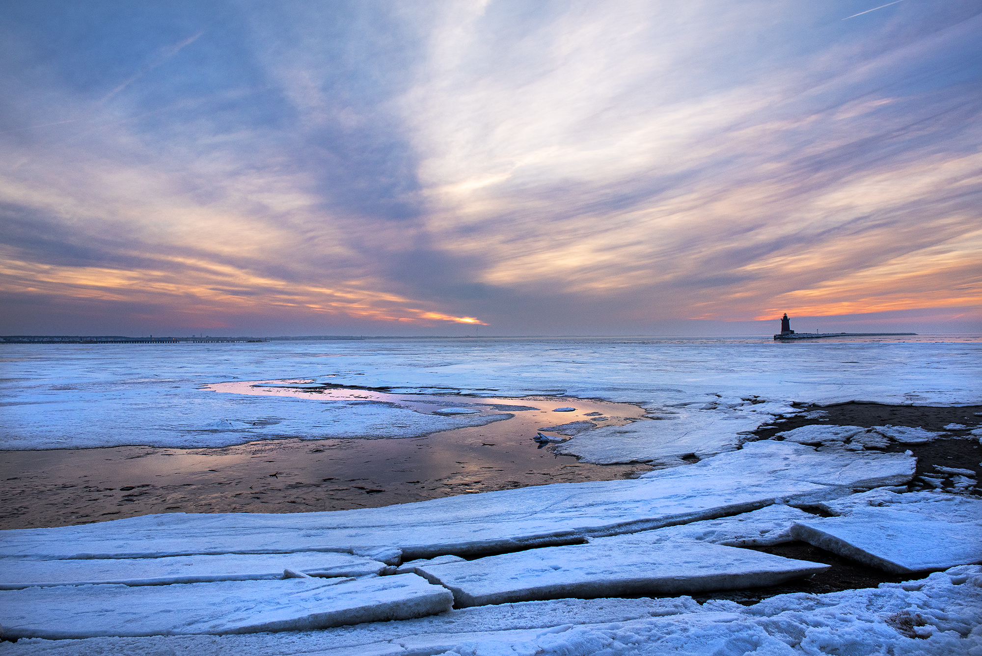 I love ice on DE Bay for photography variety so with the very cold weather we had last week I started to hope for ice up sometime this winter. Then weather conditions changed and we have had a couple of days of well above average temperatures and any thoughts I had of ice forming in DE Bay evaporated. Rain today is ahead of colder air moving back in with temps dropping a little now. The forecast shows much colder conditions by next weekend with one local meteorologist hinting at the possibility of snow. Today DE Bay water near Cape Henlopen is 40 F-41 F degrees. Sea water freezes at around 28.4 F or a little water when mixed with fresh water. NOAA’s 30 day forecast for the Mid-Atlantic area is for slightly colder than average so maybe we will see some ice build up later in the month. If so, views like this could occur.