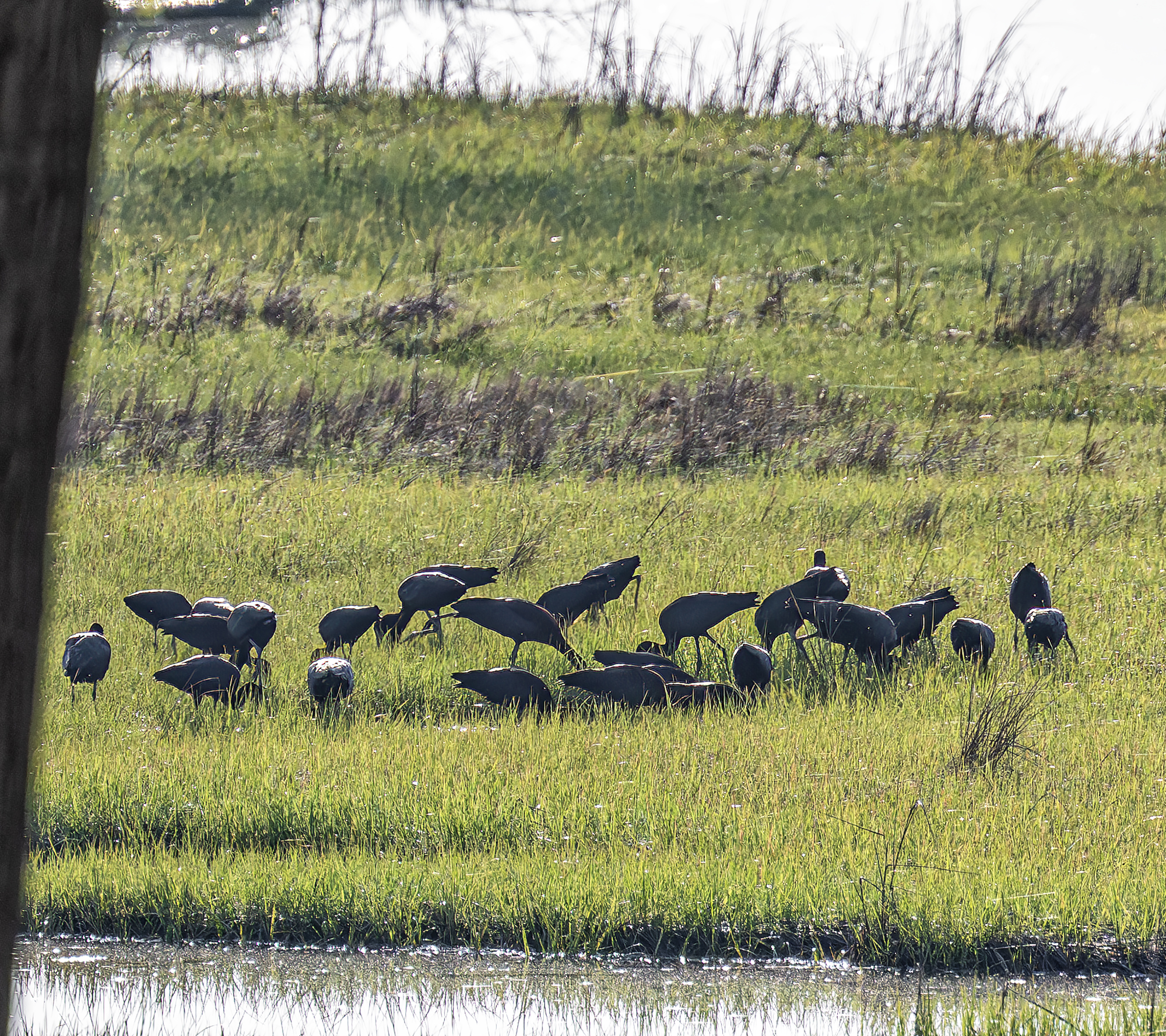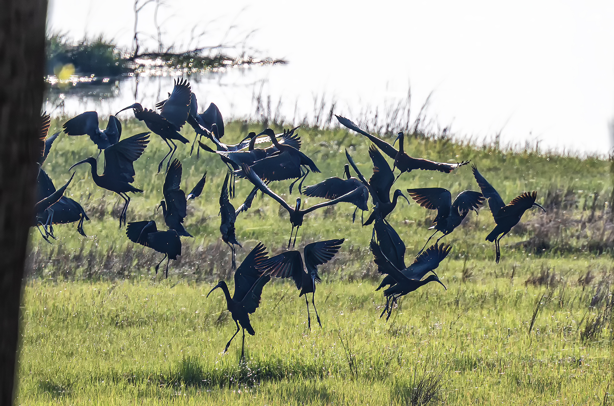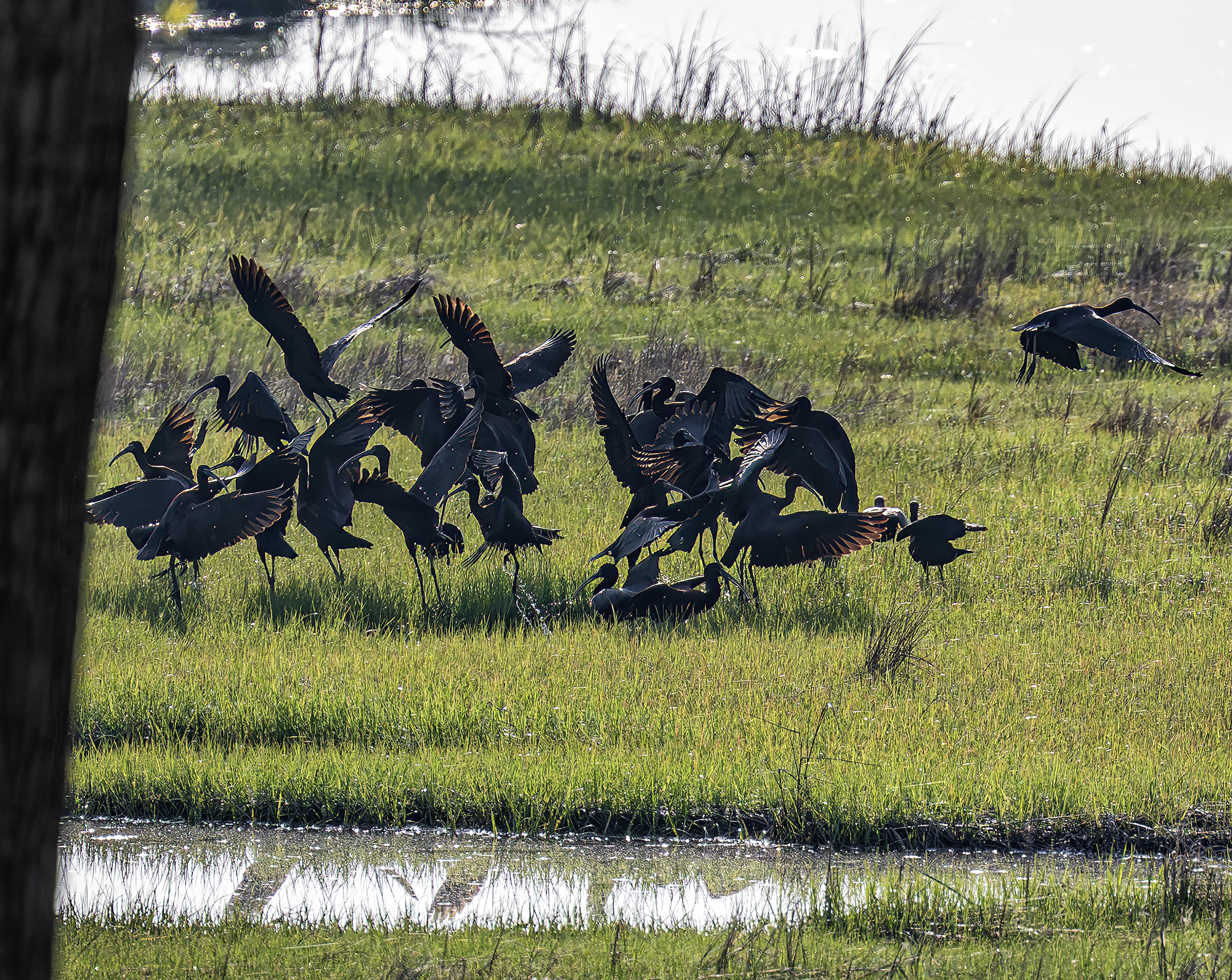 We were visited by a flock of Glossy Ibis this morning in the marsh behind our house. They were pretty severely backlit which is less than ideal for a photograph of a dark bird. But, when it comes to wildlife photography I know I have to take advantage of the moment because assuredly they will not hang out there until the sun comes around and lights them up from the front. I did wait this morning for action, which took a while. The ibis were busy grazing in the marsh seeking any type of salt marsh invertebrates to start their day. I was easily a hundred yards from them using my telephoto, teleconverter and tripod. as I watched them through my lens they spent a long time walking and grazing but then, quite suddenly and without detectable warning, the group spontaneously jumped into the air only to light right back down. It is hard to know what caused that behavior. I did not get it in camera the first time but I waited a while to see if they would do it again. There is virtue in patience it is said and sure enough my patience paid off. This photo is more about interesting action captured as well as I could considering harsh lighting and distance for subject but the three images tell a bit of a story.