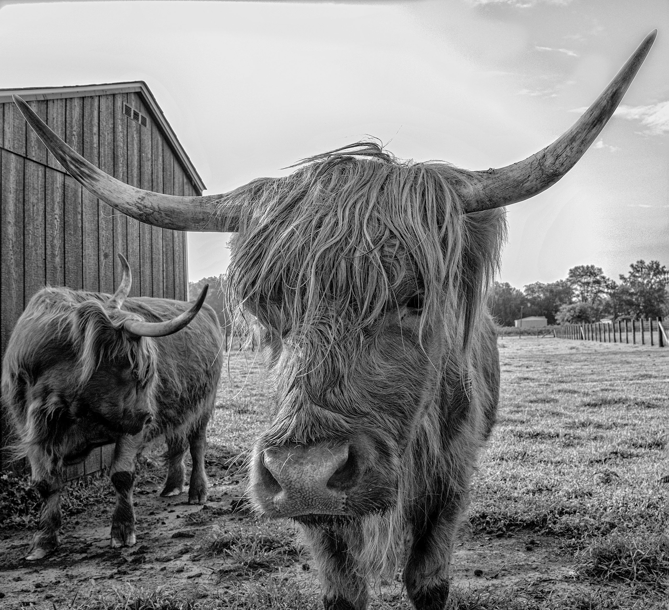 I photographed this beautiful young lady and her friend this morning at Parsons Farms Produce in Dagsboro. They are Highland cattle from Scotland. I photographed a Highland in a farm field in the middle of nowhere/somewhere Vermont a few years ago and loved his/her look. I never expected to find more of them so close to home. Somehow their look, to me, yells out black and white photograph. I will post a color photo of them in the future.