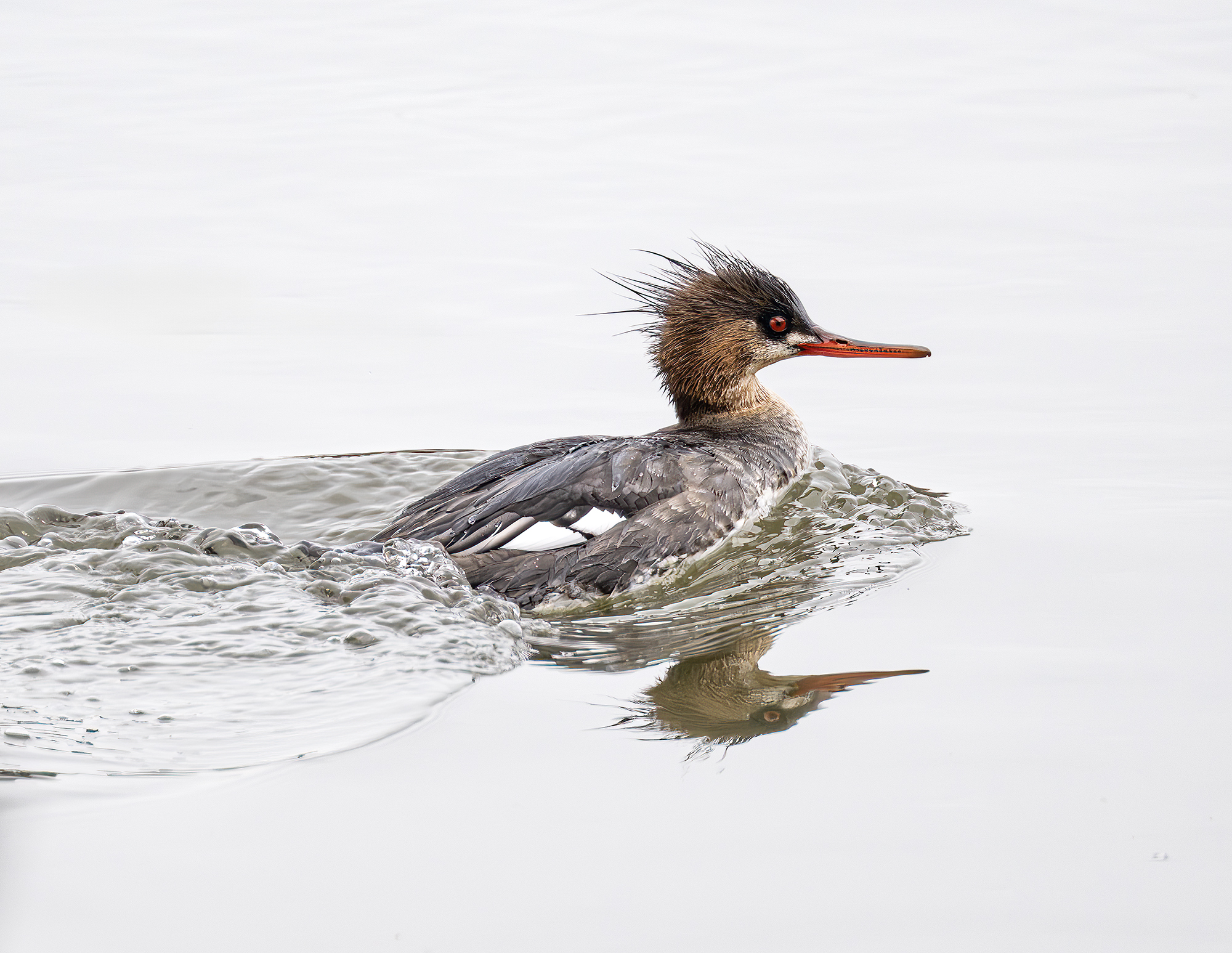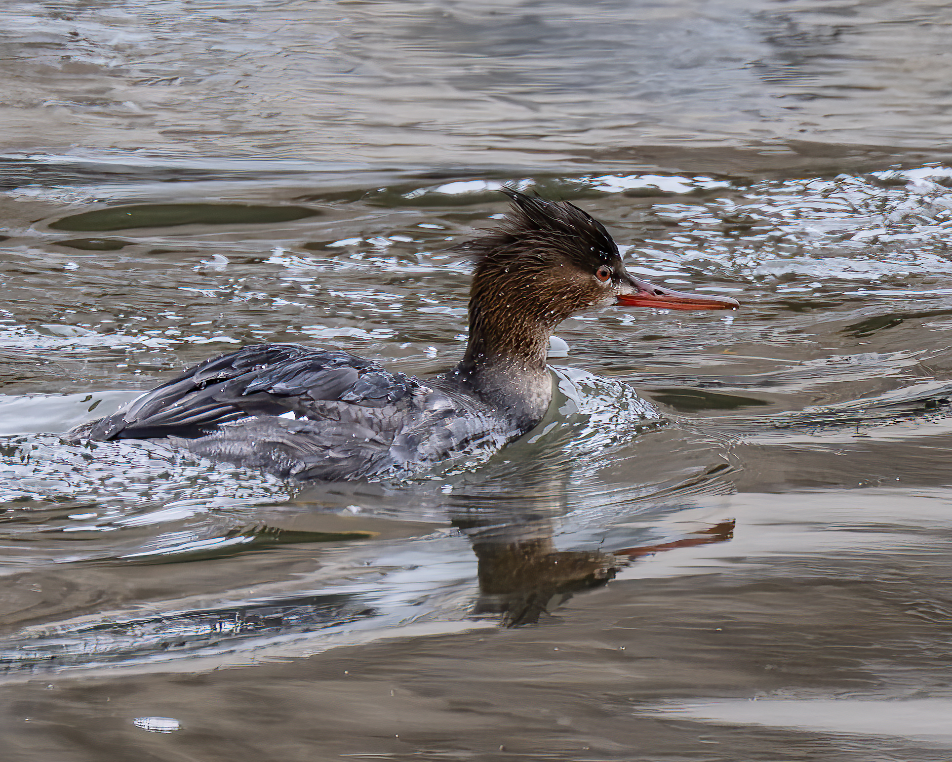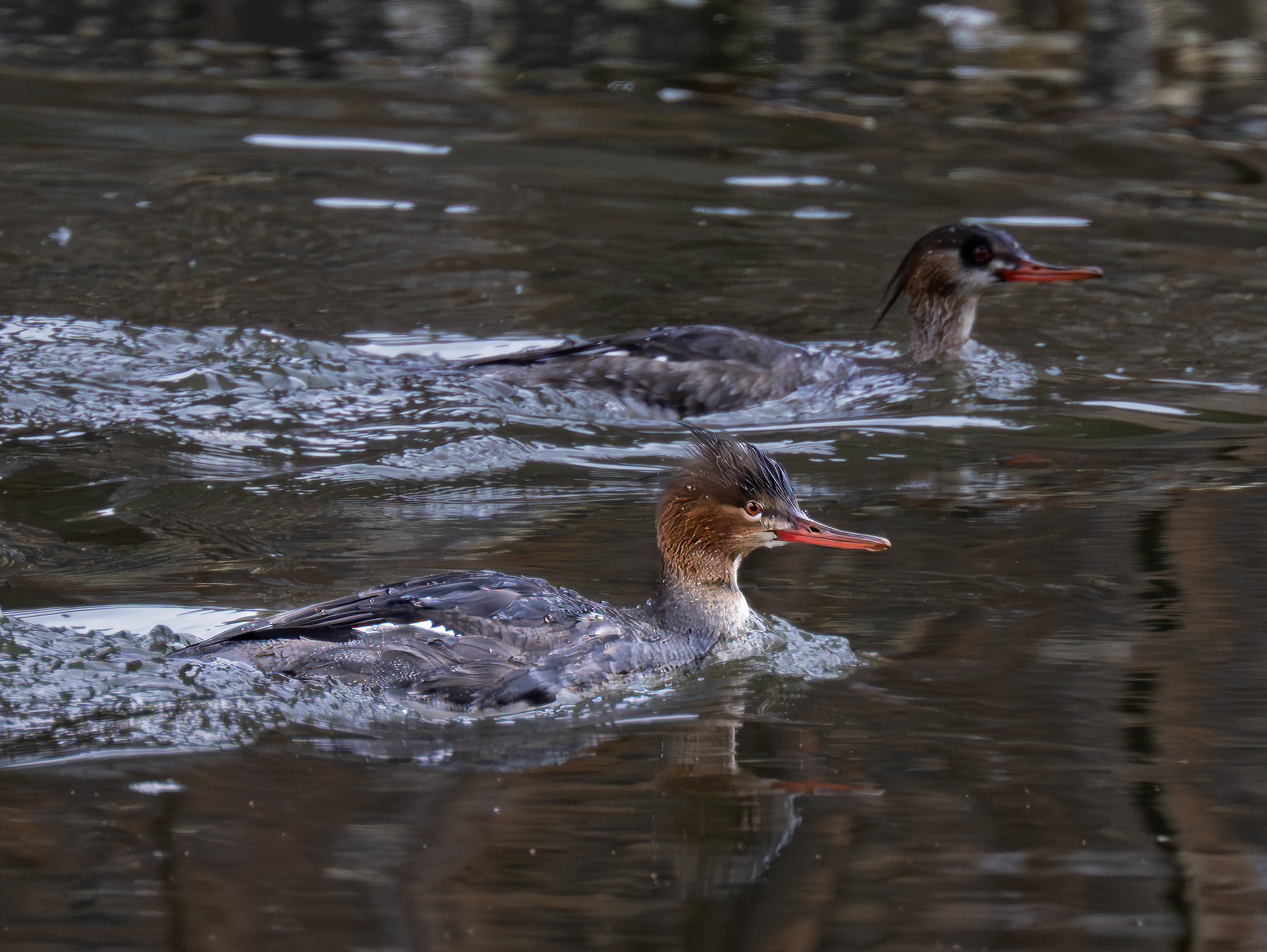 I found Red-breasted Mergansers yesterday fishing along the shore.  They went in and out of interesting light so here are a few shots with very different lighting conditions.  They are very photogenic ducks.