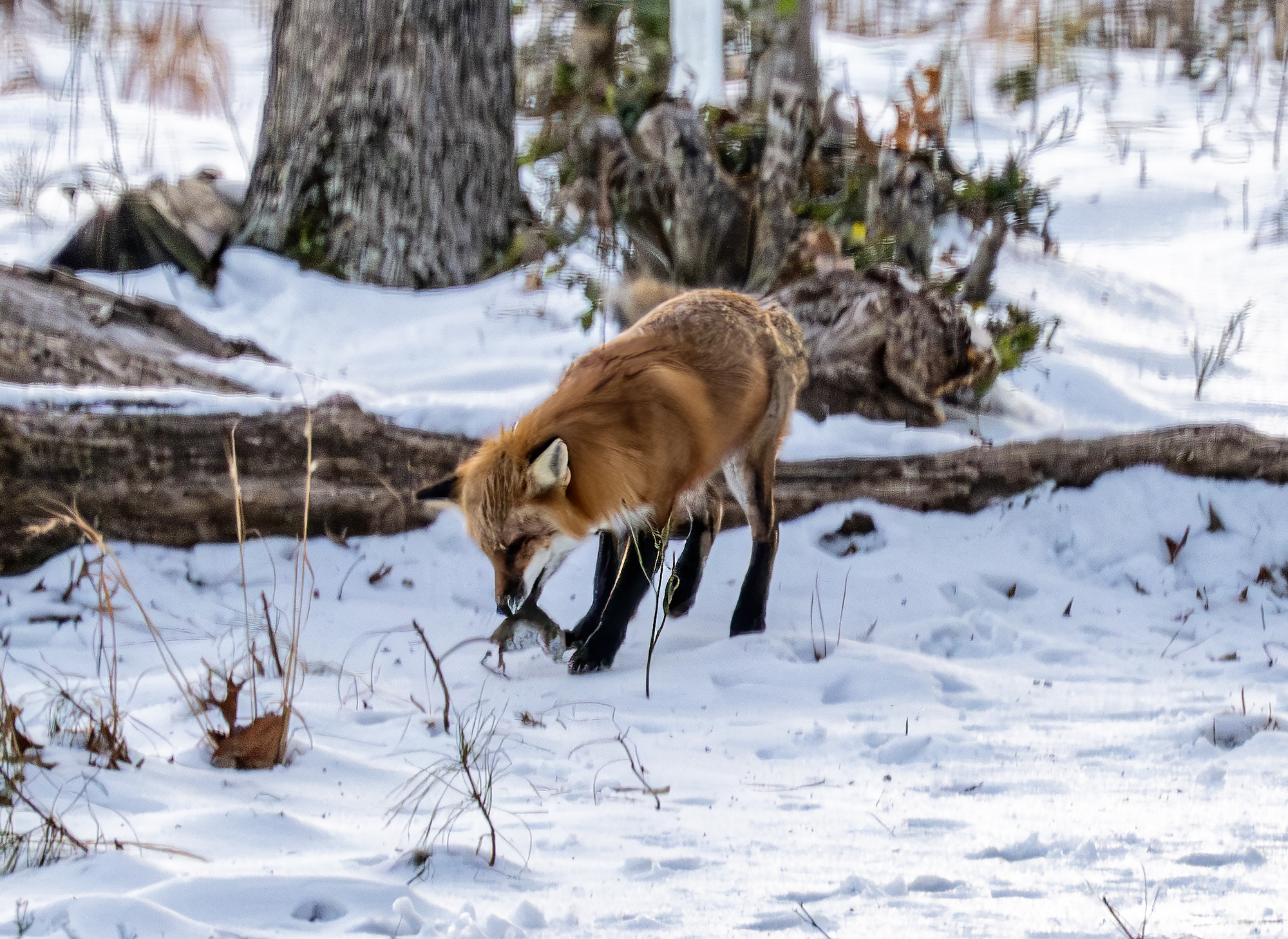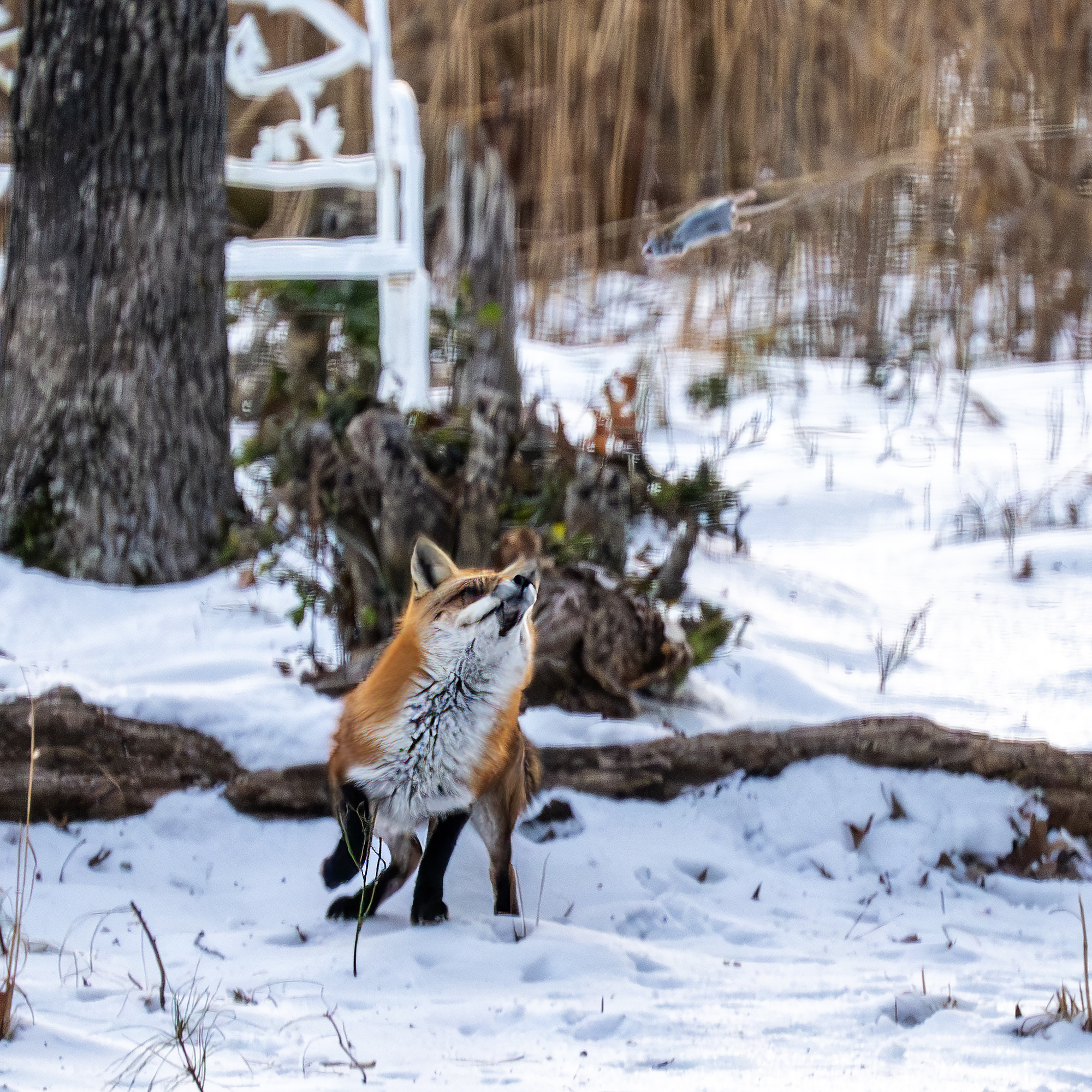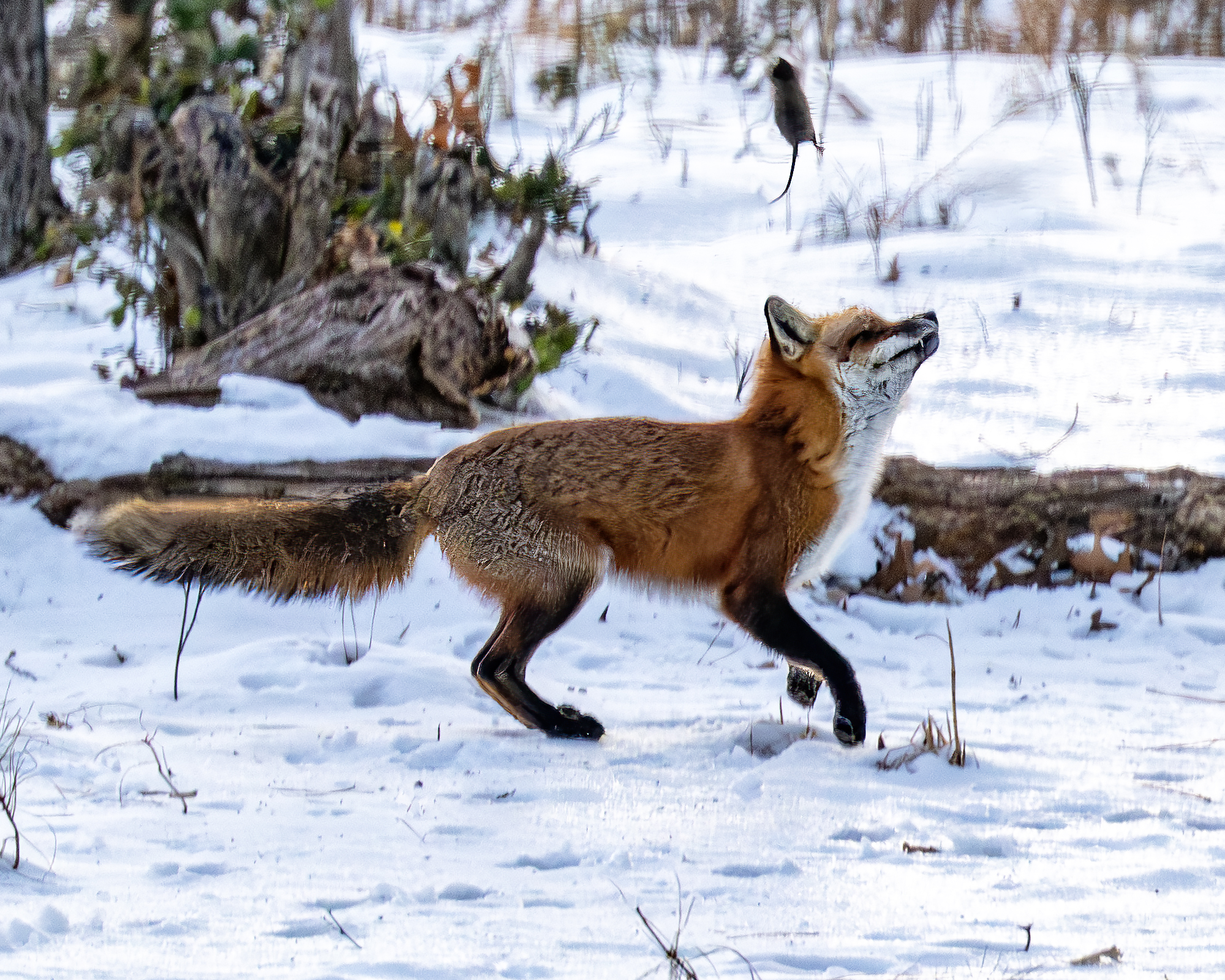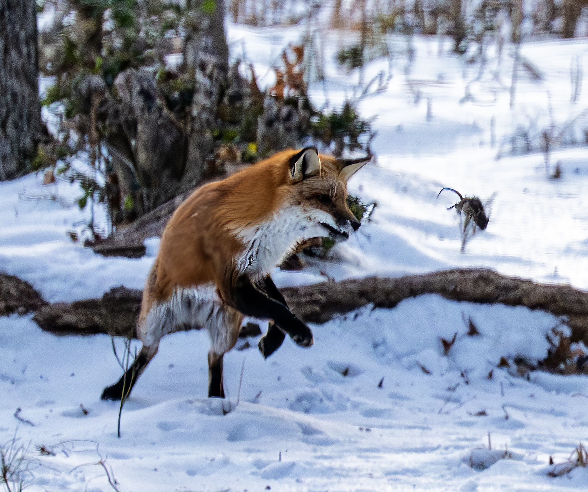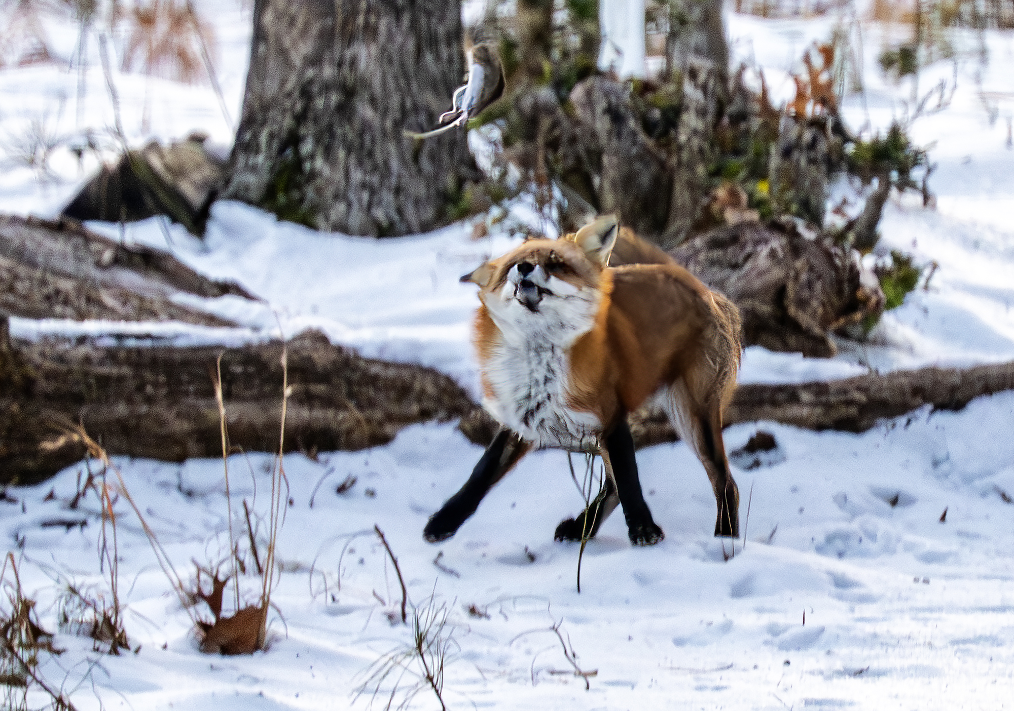 The woods behind my house are rich with wildlife activity. This morning, seen out of my back window while enjoying a hot cup of coffee and not too long after sunrise, a fox was toying with its morning breakfast. I guess this is a white footed mouse (please correct me if you know) that the fox was tossing in the air over and over again before carrying off to eat. I keep my Nikon z9 with its 100-400 mm zoom lens and 1.5 tele on a table near the back windows and deck ‘just in case’. So, through the window, hand held and about 50 yards from the fox I shot the action. I hurried to start photographing because, as you wildlife photographers know, good action often ends too quickly and I have often missed the good shot by just a second or so. Today the fox kept up the action and, while the technical photography skills are lacking a bit (if only I could have been out on the deck, camera on a tripod and probably a little faster ISO) I am pretty happy with the action captured despite the images being a little under my preferred standard. It’s a case of subject better than tech quality. I am thankful for the experience I witnessed and got to shoot.