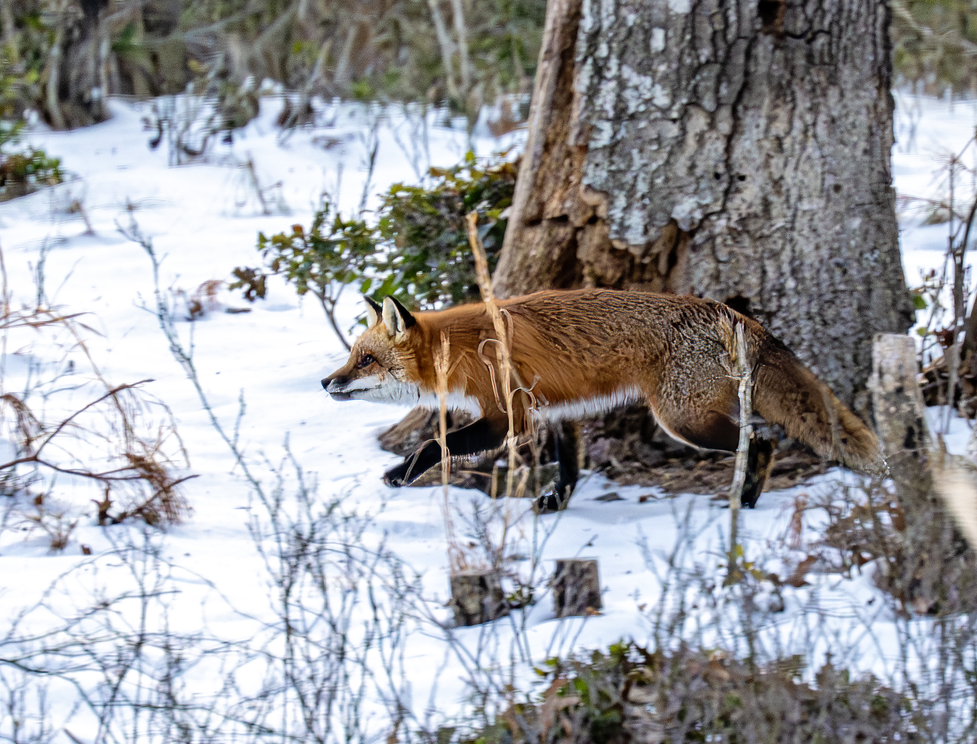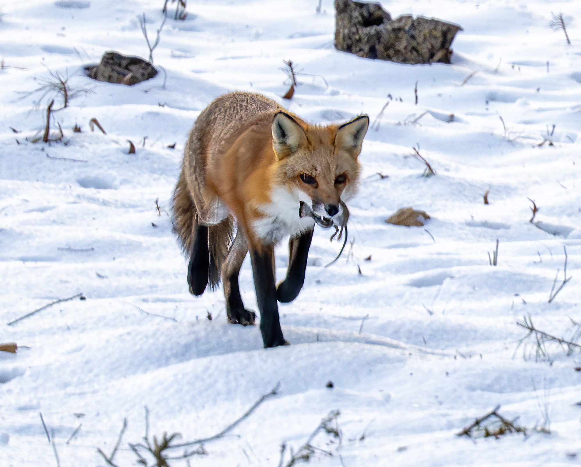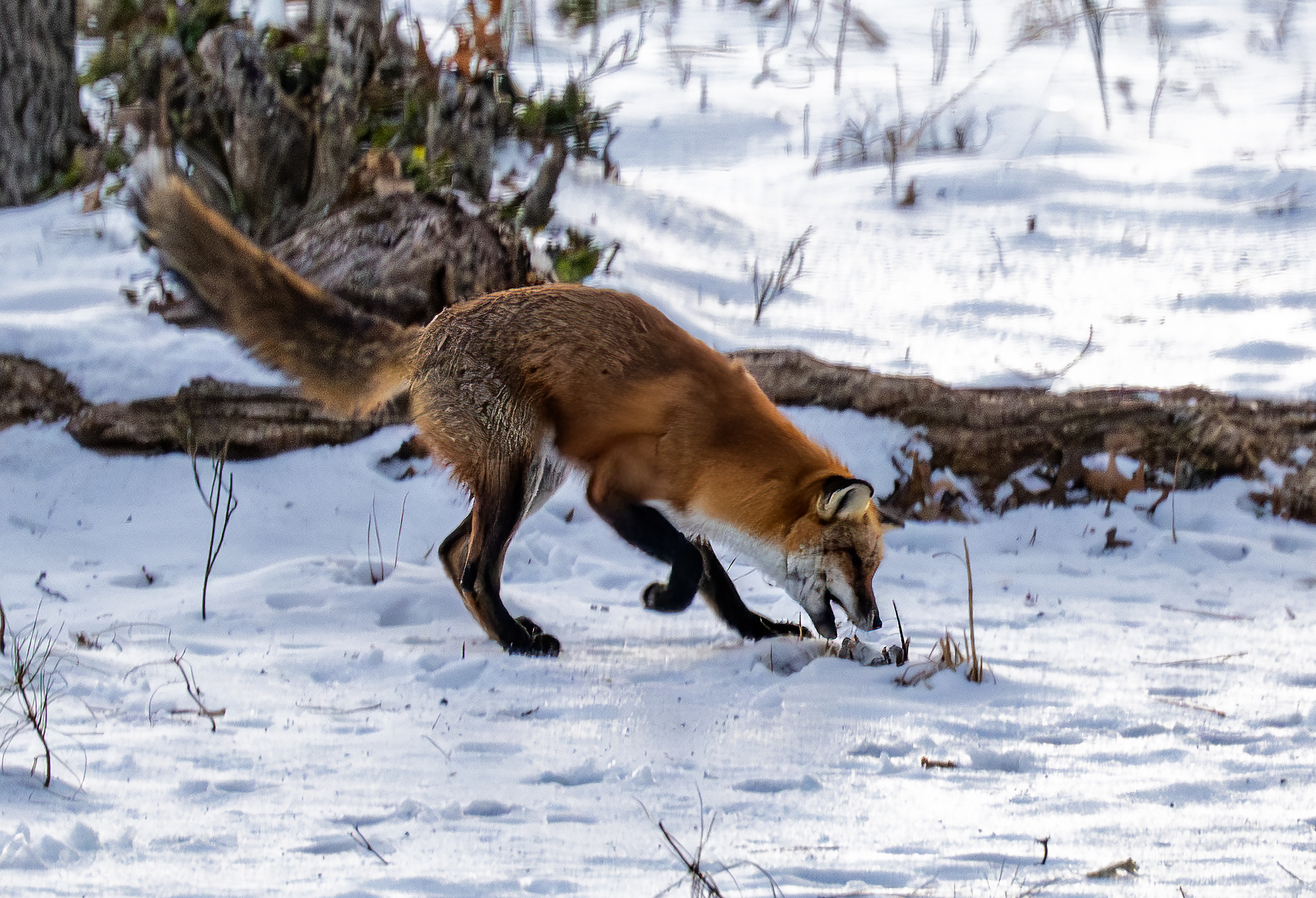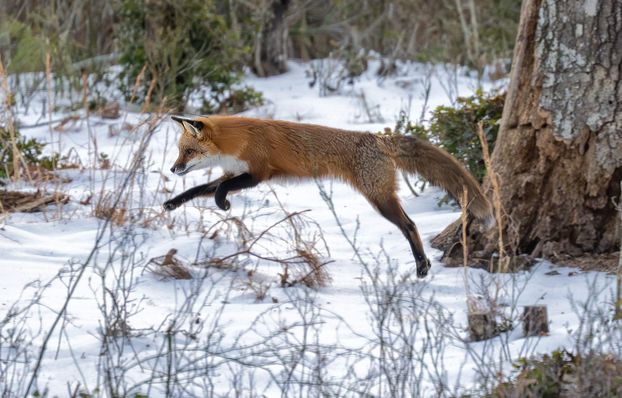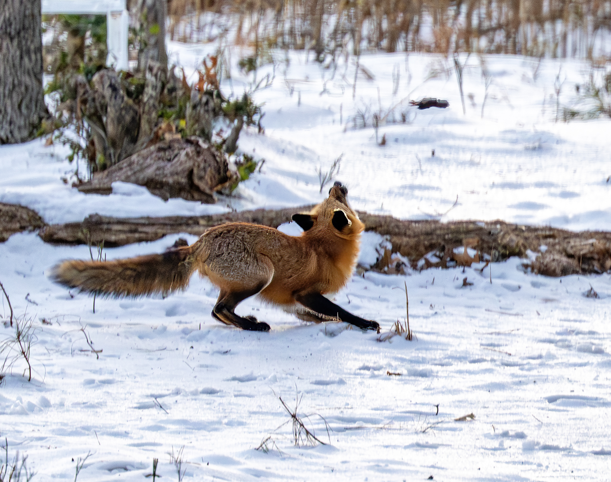 The woods behind my house are rich with wildlife activity. This morning, seen out of my back window while enjoying a hot cup of coffee and not too long after sunrise, a fox was toying with its morning breakfast. I guess this is a white footed mouse (please correct me if you know) that the fox was tossing in the air over and over again before carrying off to eat. I keep my Nikon z9 with its 100-400 mm zoom lens and 1.5 tele on a table near the back windows and deck ‘just in case’. So, through the window, hand held and about 50 yards from the fox I shot the action. I hurried to start photographing because, as you wildlife photographers know, good action often ends too quickly and I have often missed the good shot by just a second or so. Today the fox kept up the action and, while the technical photography skills are lacking a bit (if only I could have been out on the deck, camera on a tripod and probably a little faster ISO) I am pretty happy with the action captured despite the images being a little under my preferred standard. It’s a case of subject better than tech quality. I am thankful for the experience I witnessed and got to shoot.