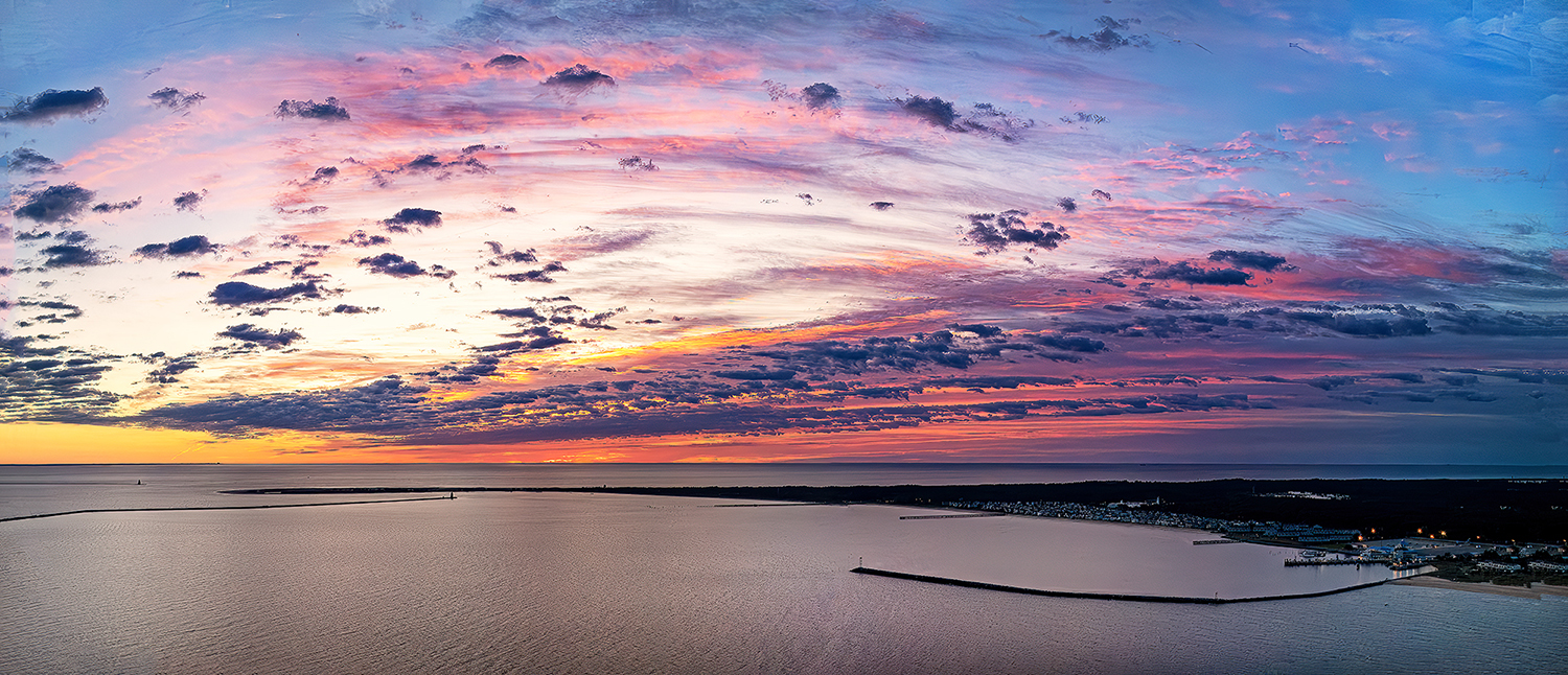 Sunrise today was pretty interesting.  Prior to the horizon dipping down to the sun (I know we observe the sun rising in relation to our planted position but it is actually the earth moving and the sun being stationary) the clouds lit up with red, pink and orange hues.  Clouds were bottom lit and their horizontal, wave-like form begged for a panoramic photograph.  Seen in this drone’s eye view of the Harbor of Refuge in Delaware Bay are the ferry breakwater, the sate park fishing pier, the Delaware Breakwater and a little bit of the Harbor of Refuge Breakwater.