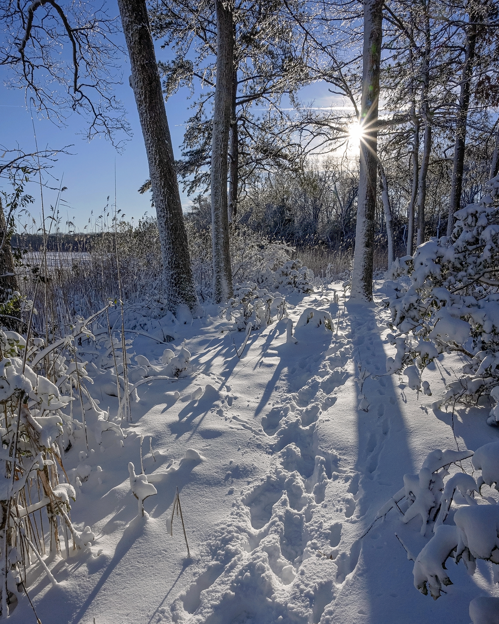The morning after the big Mid-Atlantic snow storm brought brilliantly clear skies and temperatures well below freezing. Winter has arrived decidedly, and I welcome the change in the weather with open arms. I love snow and cold, at least for a few weeks of the winter. The scene in the woods behind my house this morning was spectacular and a rarity on the Delaware coast.